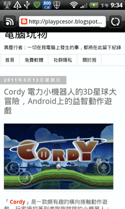 | Cordy 電力小機器人的3D星球大冒險,Android上的益智動作遊戲 Posted: 13 Mar 2011 04:20 AM PDT 「Cordy」是一款頗有趣的橫向捲軸動作遊戲,玩家操控著到處跑跑跳跳的小機器人:Cordy,在一個類3D的大型機械星球中闖蕩各種新鮮的關卡(之所以說類3D,是因為世界是3D,但實際遊戲過程是2D移動的),遊戲的目標是讓小機器人收集足夠電力,最後為每一個世界重新注入啟動能量。 這是一款免費的Android遊戲,說明上寫著適用於Android 2.1以上系統,遊戲設計者似乎打算隨著不斷更新來陸續推出新關卡,目前的版本則是Cordy 1.31,我今天剛剛更新,並獲得了第二個新世界(其實就是第二大關)。 Cordy這款可愛風格的手機遊戲融合了類似超級瑪莉的動作反應挑戰,以及物理遊戲的益智謎題,在輕鬆的氣氛中蘊含樂趣。遊戲中Cordy不會死亡(起碼目前關卡看起來不會),玩家可以很悠閒的慢慢解謎,遊戲不會催你破關,但是玩家也可以在重玩時挑戰在時限內完成的新成就,或是收集關卡內所有物品。