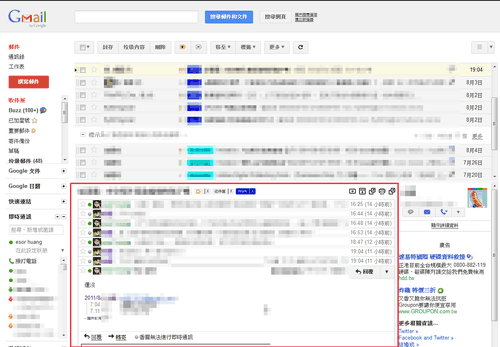 而在Gmail中進入「研究室」,啟用最新的「預覽窗格」項目。 回到Gmail郵件清單,可以在郵件列表右上方看到一個〔切換預覽窗格〕按鈕,我們可以隨時打開或關閉預覽窗格。 而且也可以指定第三欄要使用垂直分割或水平分割,就跟傳統郵件軟體介面一樣。 如果是垂直分割的話,郵件內文預覽會顯示在右方,我們可以「拖曳」郵件列表與郵件內文中間的分隔線,改變預覽窗格的大小。 另外在郵件內文預覽的右方還會有一列通信者快速聯絡功能,這是Gmail郵件內文瀏覽時原本就有的功能,但放在預覽窗格裡似乎就有點佔用空間。或許Gmail可以考慮在預覽窗格的垂直分割情況下,自動暫時取通信者快速聯絡功能。 但是如果使用水平分割的話,右下方的通信者快速聯絡功能看起來就比較不會佔用太多空間了。 只是這時候佔用空間的反而是上方Gmail、Google預設工具列,還有整個瀏覽器視窗畫面。這些額外的空間支出會讓三欄式預覽窗格看起來比較擁擠,如果這要變成正式功能,或許要考慮空間的彈性調配。 另外,預設情況下,當你切換郵件清單項目並在預覽窗格查看內文時,必須停留三秒以上才會把該封郵件設定為已讀取。 如果你想改變這個預設值,也可以到Gmail一般設定裡找到相關項目進行調整。 |