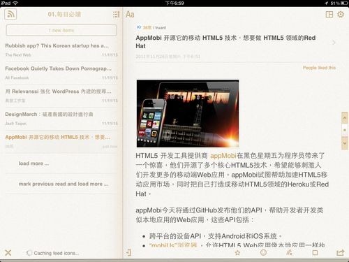 iPad上讀Google Reader的工具非常多,我自己偏愛有免費版的「Perfect RSS Reader」,不過用哪個工具是看個人喜好,尤其當這些工具都很優秀時。 我想說的關鍵是,iPad是一個閱讀Google Reader的優秀裝置,上面許多App都可能幫Google Reader帶來更舒適、更便捷的閱讀體驗,而iPad這個裝置本身也可以讓我在各種場合(包括躺在床上時)更輕鬆的讀資訊。